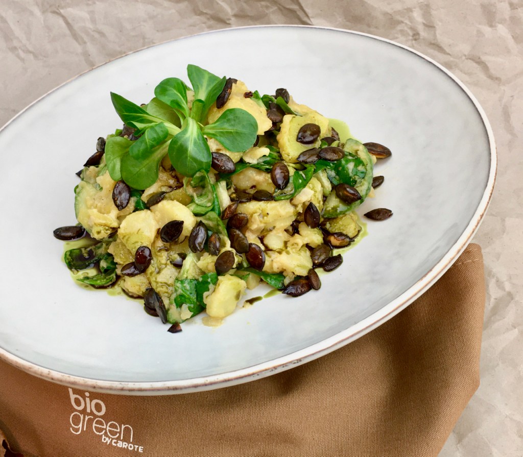Anders als die meisten anderen kommt unser Rezept ganz ohne gebratenen Speck aus und ist damit sogar gänzlich vegan. Für den „Crunch“ sorgen hier geröstete Kürbiskerne, die diesem Kartoffelsalat zusammen mit dem Kernöl seinen außergewöhnlichen Charakter geben. Natürlich könnte man Speck verwenden, aber getreu unserem Motto *Intelligenza Nutrizionale* beschreiben wir hier die gesündere Version.