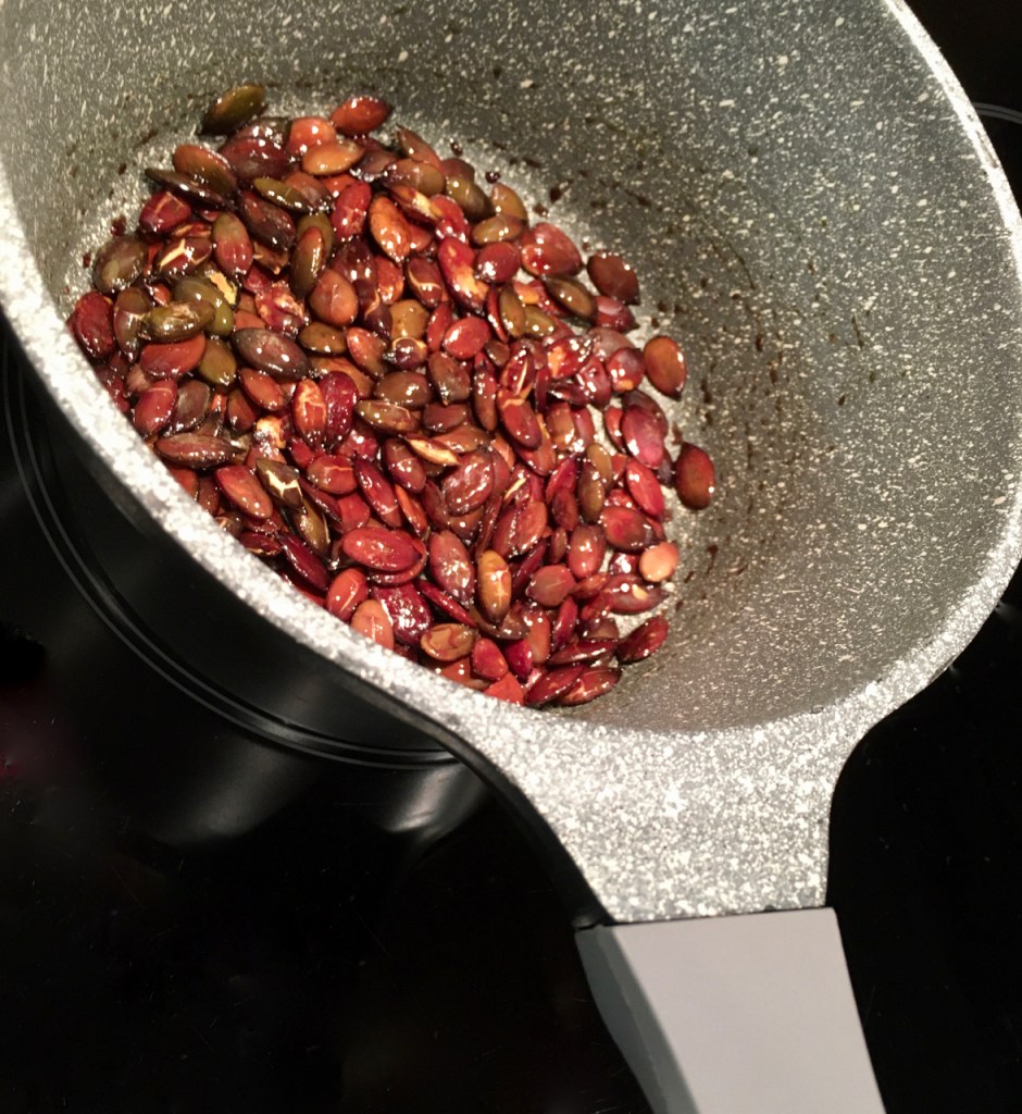 Kürbiskerne mit ½ TL Kürbiskernöl in einer kleinen beschichteten Pfanne auf mittlerer Hitze rösten, bis sie zu platzen beginnen.
