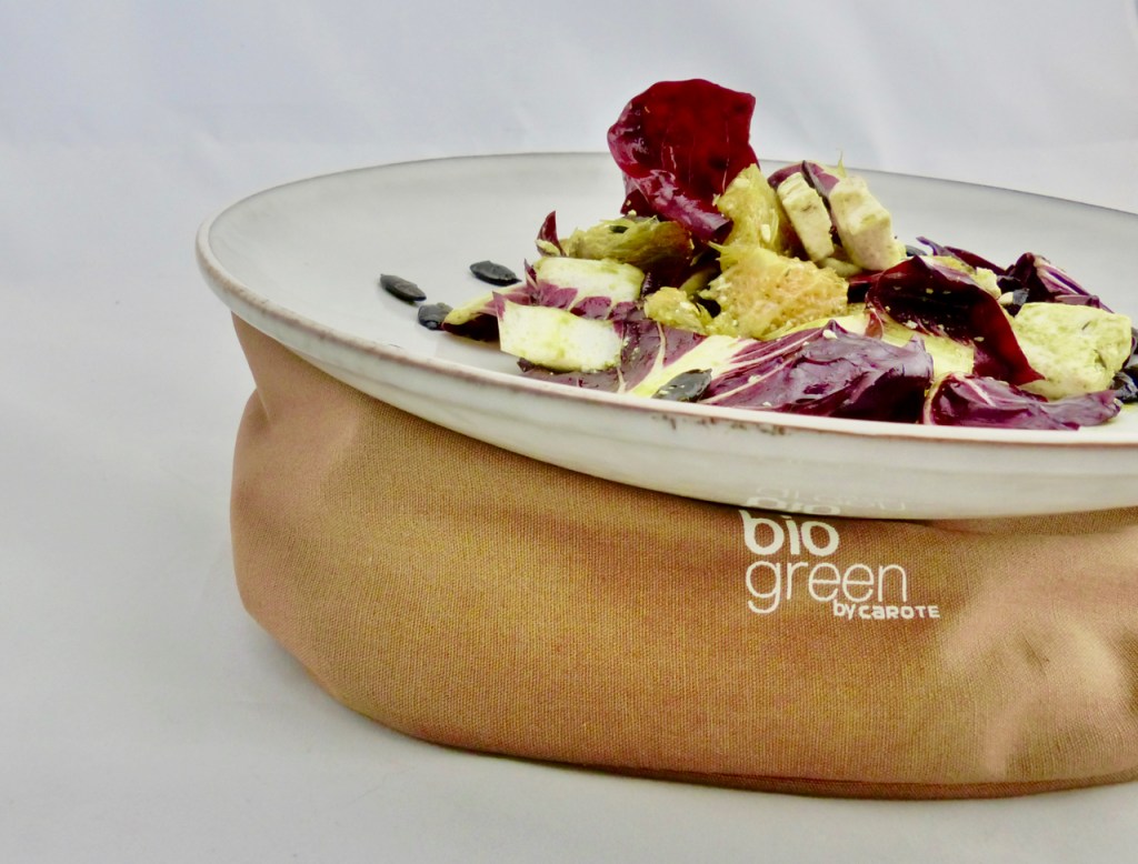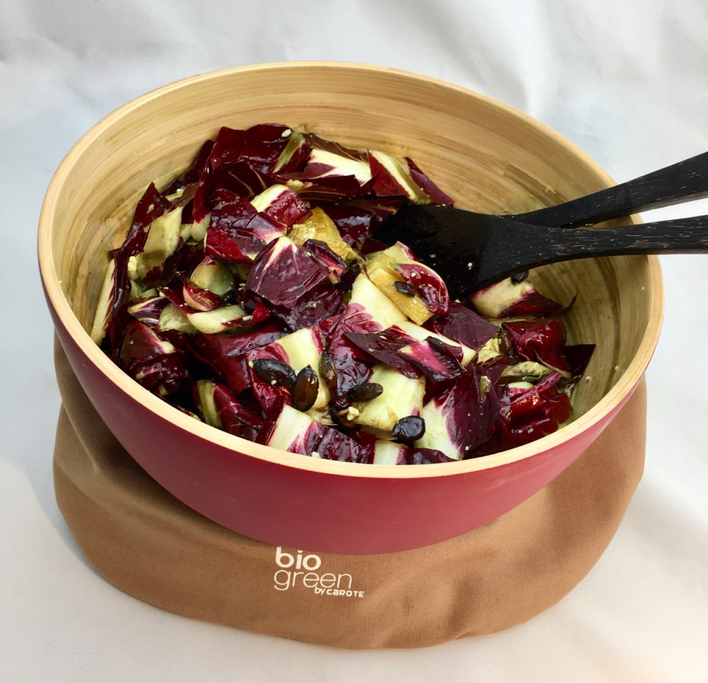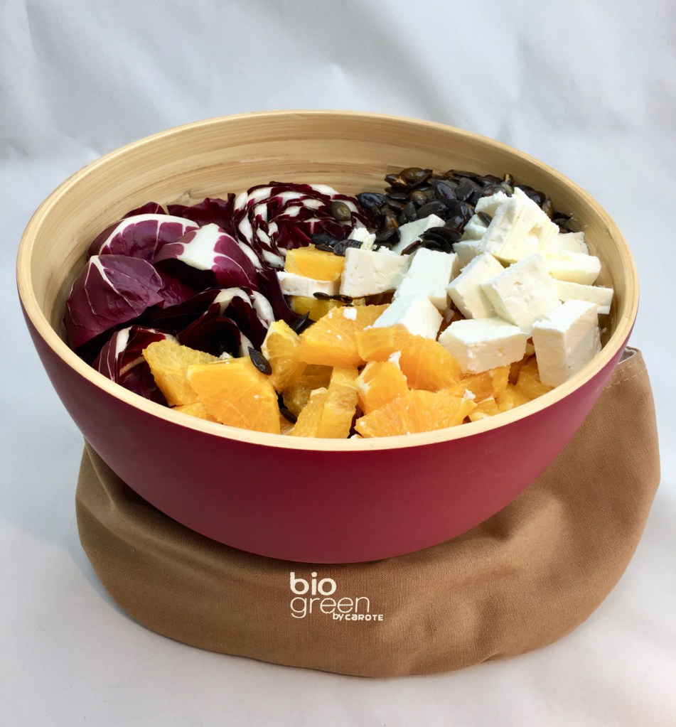Süße, vollreife Orangen und steirisches Kürbiskernöl nehmen der Bitterkeit des Radicchio die Spitze und der cremige Feta von der Insel Lesvos (im Deutschen auch „Lesbos“ genannt) tut ein Übriges, um diesen Salat zu einem echten Überflieger zu machen. Geröstete Kürbiskerne geben zusätzlichen Crunch und gesunder Ingwer harmoniert ganz wunderbar mit Orangen.