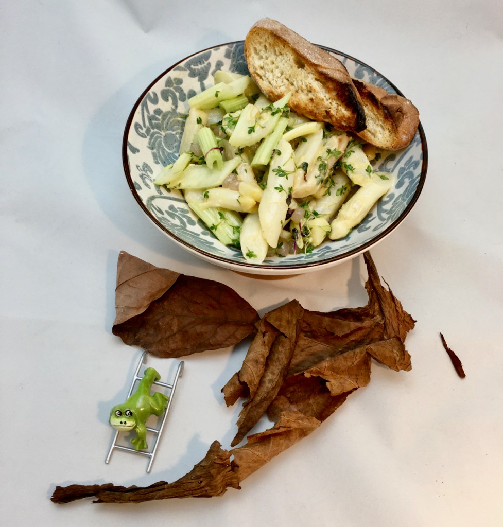 Wenn Kartoffeln und Spargel gar sind, ist es zweckmäßig zu zweit zu sein: Einer schält die Kartoffeln und schneidet sie in 1 cm dicke Scheiben, der andere schneidet den Spargel in ca. 4 cm Stücke. Lagenweise isn die Schüssel zum Sellerie geben, die Vinaigrette nochmals gut durchschütteln und portionsweise darüber geben. Am Schluss alles gut durchmischen und etwa 10 Min. ziehen lassen.