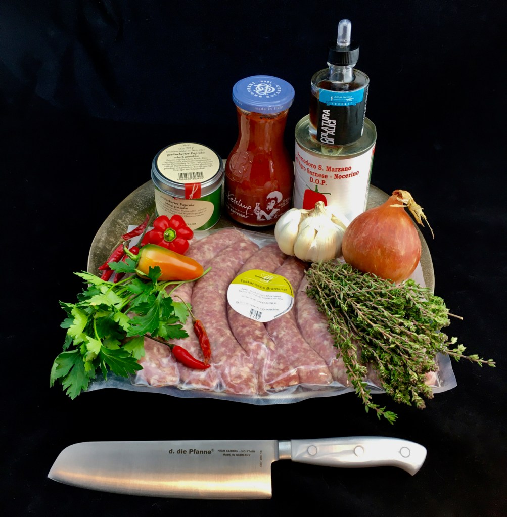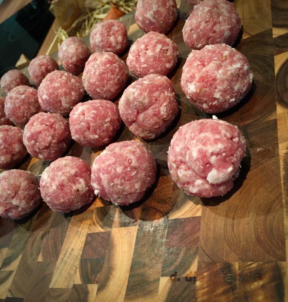 Streng genommen sollte man ja wissen, was im Hackfleisch drin ist und deshalb packen wir auch meistens den Fleischwolf aus und drehen es selbst durch. Aber für unsere Polpette hat sich mittlerweile eine ‚Abkürzung‘ bewährt – wir machen die aus Toskanischer Bratwurst (Salsiccia) und zwar aus einer, von der wir wissen, dass außer Schweinefleisch, Schweinespeck, Steinsalz, Fenchelsamen, Nitritpökelsalz, Naturdarm vom Schaf nichts drin ist, was da nicht rein gehört.