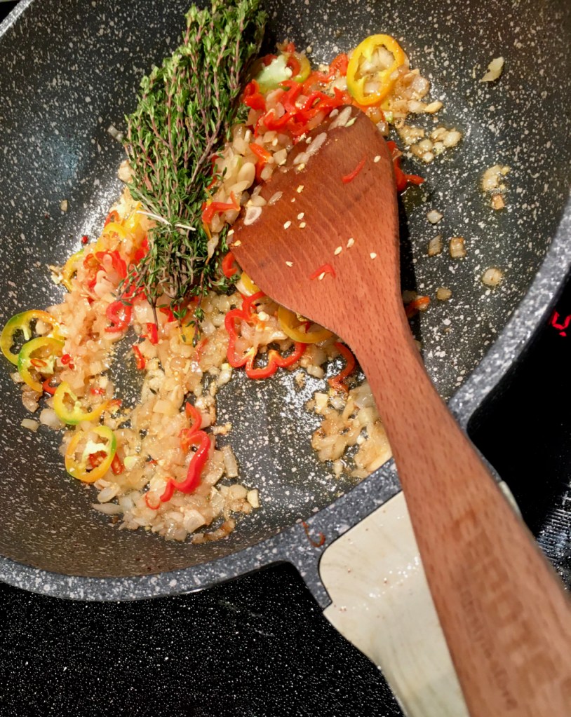 Das restliche Olivenöl in die Pfanne geben und Zwiebel, Knoblauch, Chilies (falls verwendet) und den Thymian dazu geben. Bei mittlerer Hitze ca. 7-10 Min. leicht bräunen, dann mit dem Wein ablöschen, auf kochen und die Tomaten dazu geben. Mit einem Holzwender zerdrücken, den Ketchup dazu geben und für ca. 20 Min. sanft schmoren. Das Tymiansträußchen herausnehmen. Mit Pfeffer aus der Mühle und Colatura di Alici (oder etwas Meersalz) abschmecken. Die Polpette dazu geben und in der Sugo erhitzen.